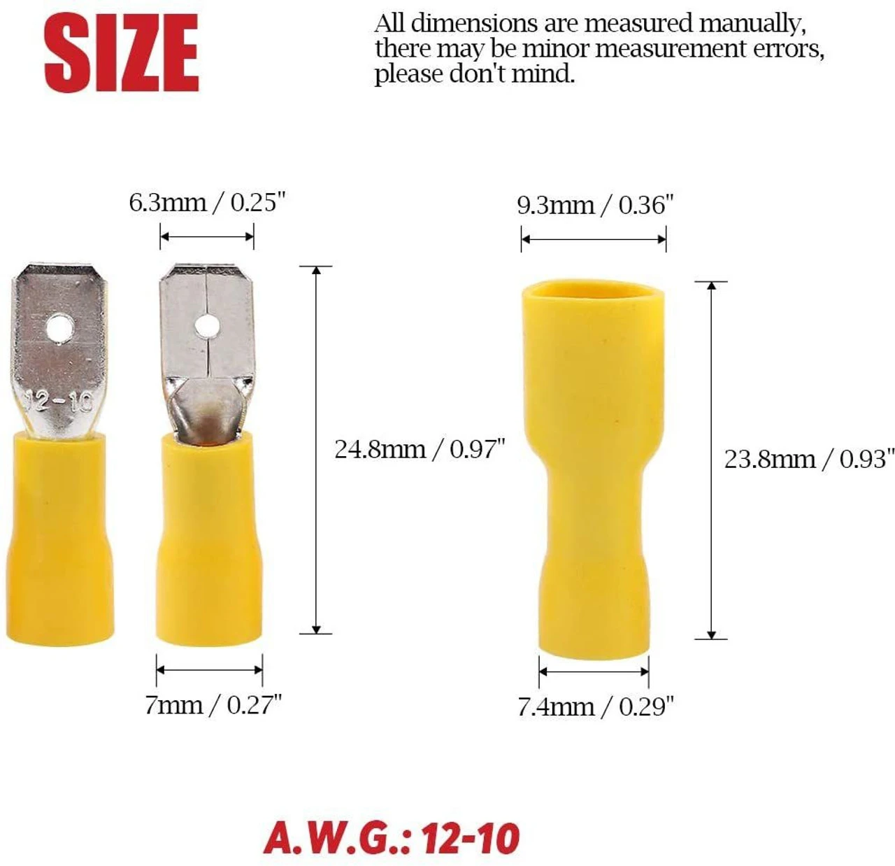 A.W.G.: 12-10, Wire range: 4.6 mm², Max current= 45A Type: Fully / Semi Insulated Male / Female Spade Quick Splice Terminals connector. These will prevent short circuits and problematic wiring that inferior connectors are known for Compliant with all electrical standards, Perfect for Vehicle, Home, or scientific project, our electrical crimp connector will ensure a strong seal to make sure everything bond correctly Function:- When the insulated terminals are closely spaced from each other, it can improve the safety of insulation, prevent the bifurcation of the wires, and make it easier to insert the wires into the plug. Feature: Our insulated Spade wire connector has good electrical conductivity and also has an insulated shell which makes it better performance