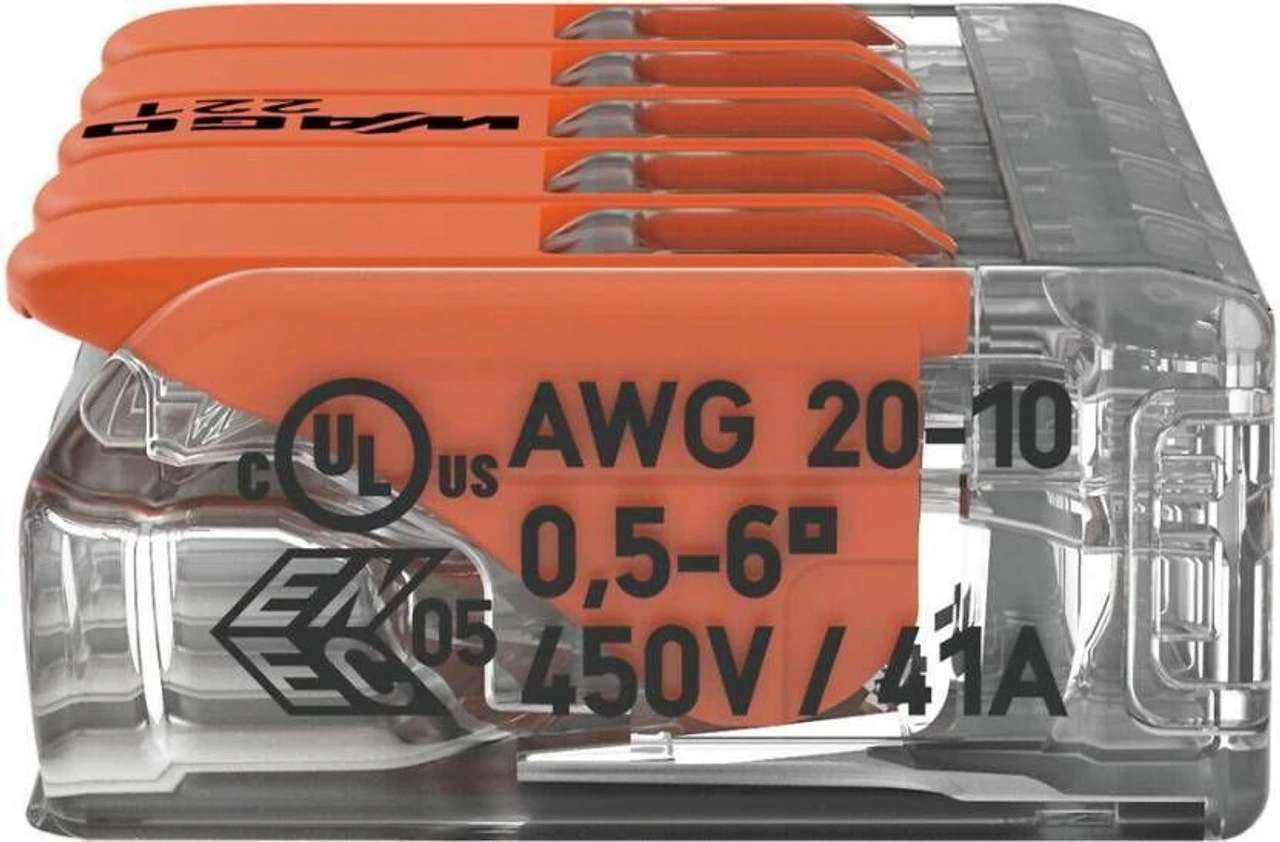 - Connect solid, stranded, and fine stranded copper wires up to 6 mm² quickly and reliably, 5 poles, 1 in – up to 4 out, Lever operated, Transparent housing