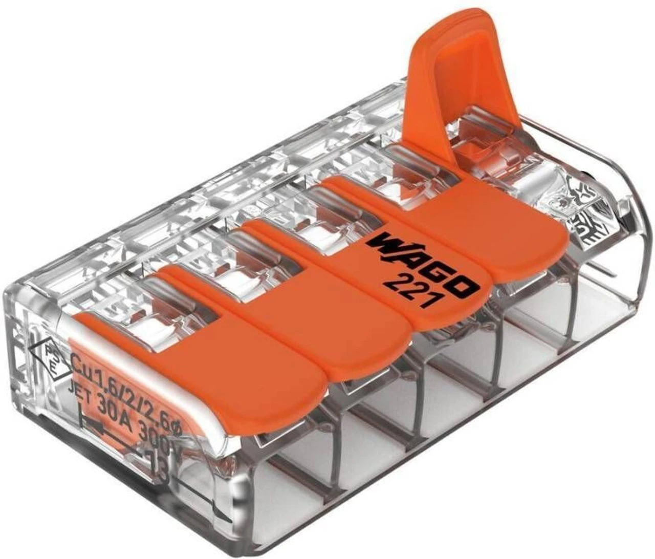 Upgrade your wiring setup with the WAGO 221-615 Lever-Nuts — a compact, tool-free solution for connecting up to five wires in one secure unit. Designed for high-load applications, this connector supports solid, stranded, and flexible copper wires from 20 to 10 AWG, making it ideal for both industrial panels, commercial and advanced home installations. The transparent housing allows easy visual inspection of wire placement and strip length, reducing installation errors and improving safety. Its lever-actuated design eliminates the need for twisting or crimping, enabling fast, repeatable, and maintenance-free connections. Rated for 450V / 30A and built to withstand temperatures up to 85°C, the 221-615 is perfect for use in junction boxes, ovens, control panels, and other demanding environments. Whether you're wiring machinery or managing complex circuits, this connector delivers German-engineered reliability trusted by professionals worldwide.